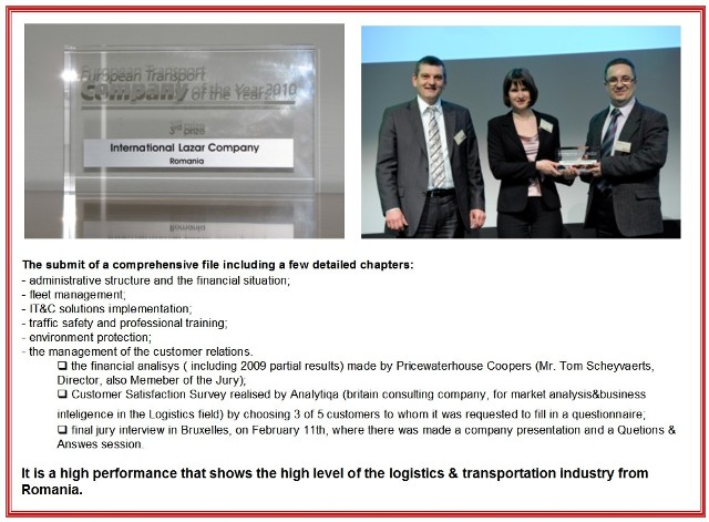 11 Feb 2010The prize "European Transport Company of the Year 2010" has been awarded on February 11th, 2010 in Bruxelles , within the framework of a ceremony that got together more than 1200 people, reprezentatives of the hauliers, of the transport industry and of the specialized press from the whole Europe. Being in the competition with another 5 finalists from Germany, Sweden, United Kingdom, Belgium and Netherlands, International Lazar Company has obtained a 3rd honorable award, after the representatives of United Kingdom and Belgium. The contest itself was hold in four steps, please see image.